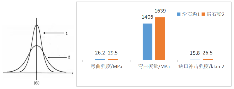 對一個(gè)滑石產(chǎn)品細(xì)度優(yōu)劣的評價(jià)不能僅憑平均粒徑D50一個(gè)指標(biāo),至少需有平均粒徑D50和最大粒徑D98(或D100)兩指標(biāo)。其平均粒徑不但要符合要求,更重要的是粒徑分布應(yīng)盡量窄,大顆粒盡量少。下圖為兩個(gè)平均粒徑相同但不同粒徑分布的產(chǎn)品。產(chǎn)品1的粒徑分布較窄、最大粒徑較小,產(chǎn)品的粗顆粒較少;而產(chǎn)品2的粒徑分布較寬,最大粒徑較大,產(chǎn)品的粗顆粒多。在其他條件相同的情況下,產(chǎn)品1改性的性能好于產(chǎn)品2。粗顆粒的大小和多少對產(chǎn)品的機(jī)械性能產(chǎn)生顯著不利影響,需要嚴(yán)格控制。