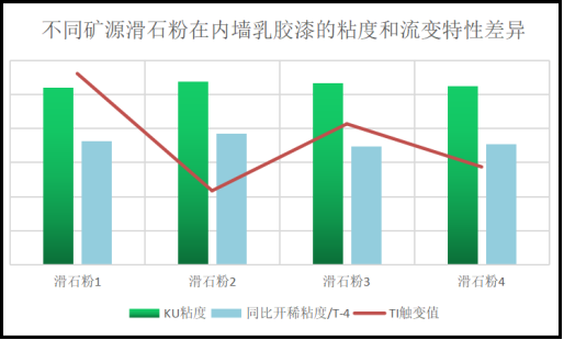 下圖為我司不同礦源的滑石粉在內(nèi)墻乳膠漆中的對(duì)比情況;由下圖可以發(fā)現(xiàn)滑石粉1粘度低,但其具有較優(yōu)異的流變TI指數(shù),說(shuō)明在配方使用滑石粉1可以使產(chǎn)品具有更寬的施工范圍,以及更優(yōu)異的施工抗流掛性;其他滑石粉則有粘度更高而觸變性更低等的情況。